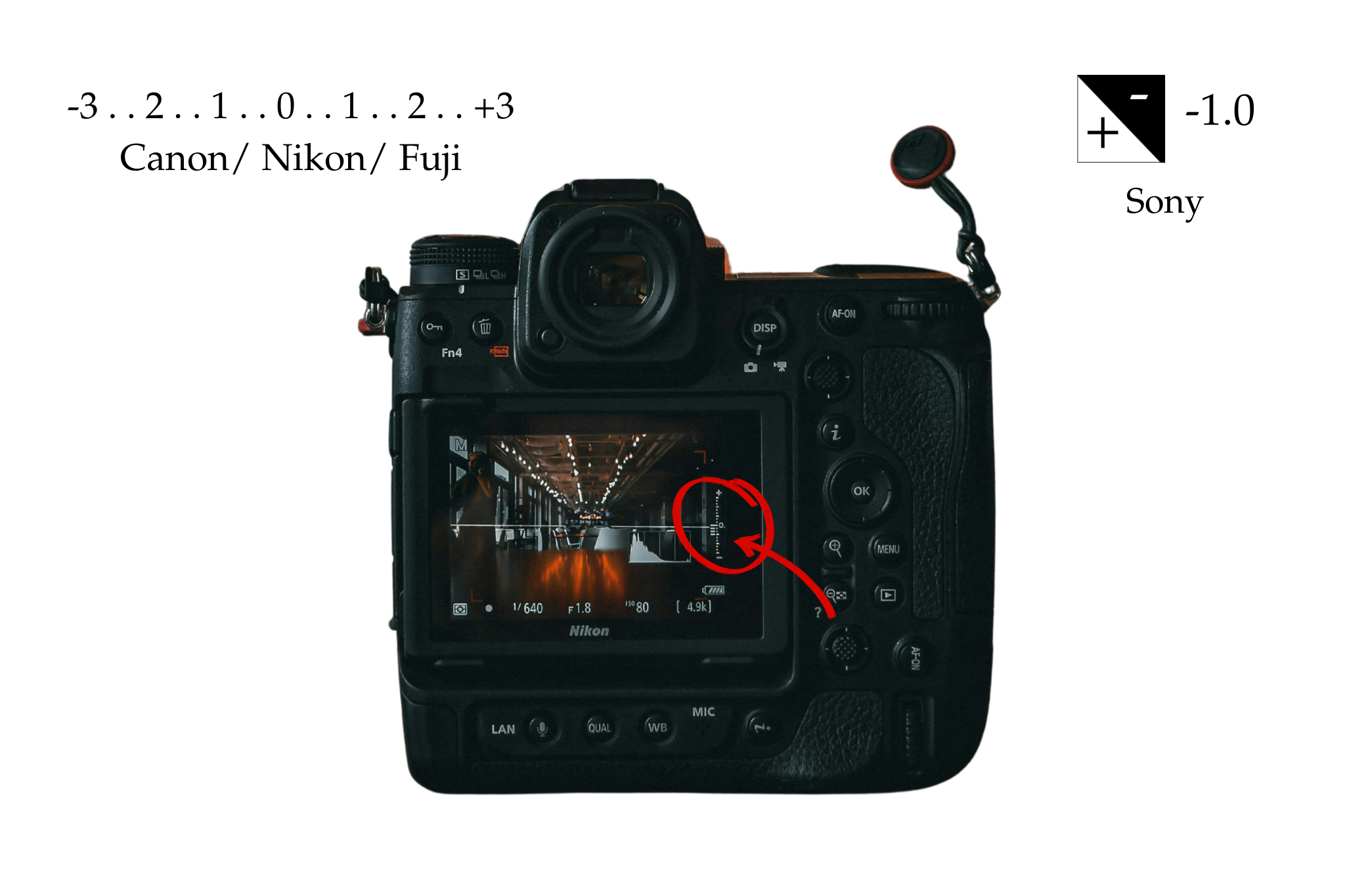 If the bar is to the right (+): The camera thinks the image will be too bright (overexposed).